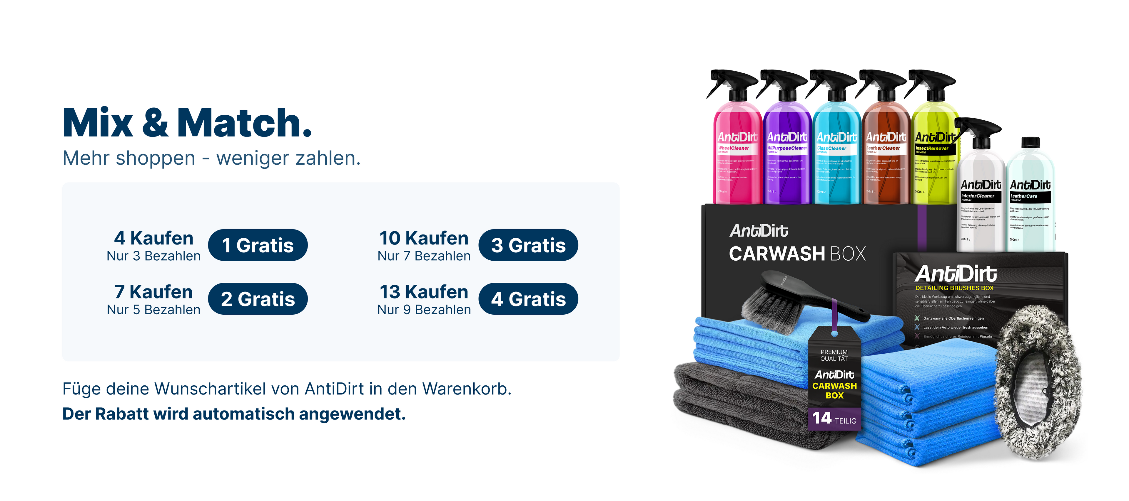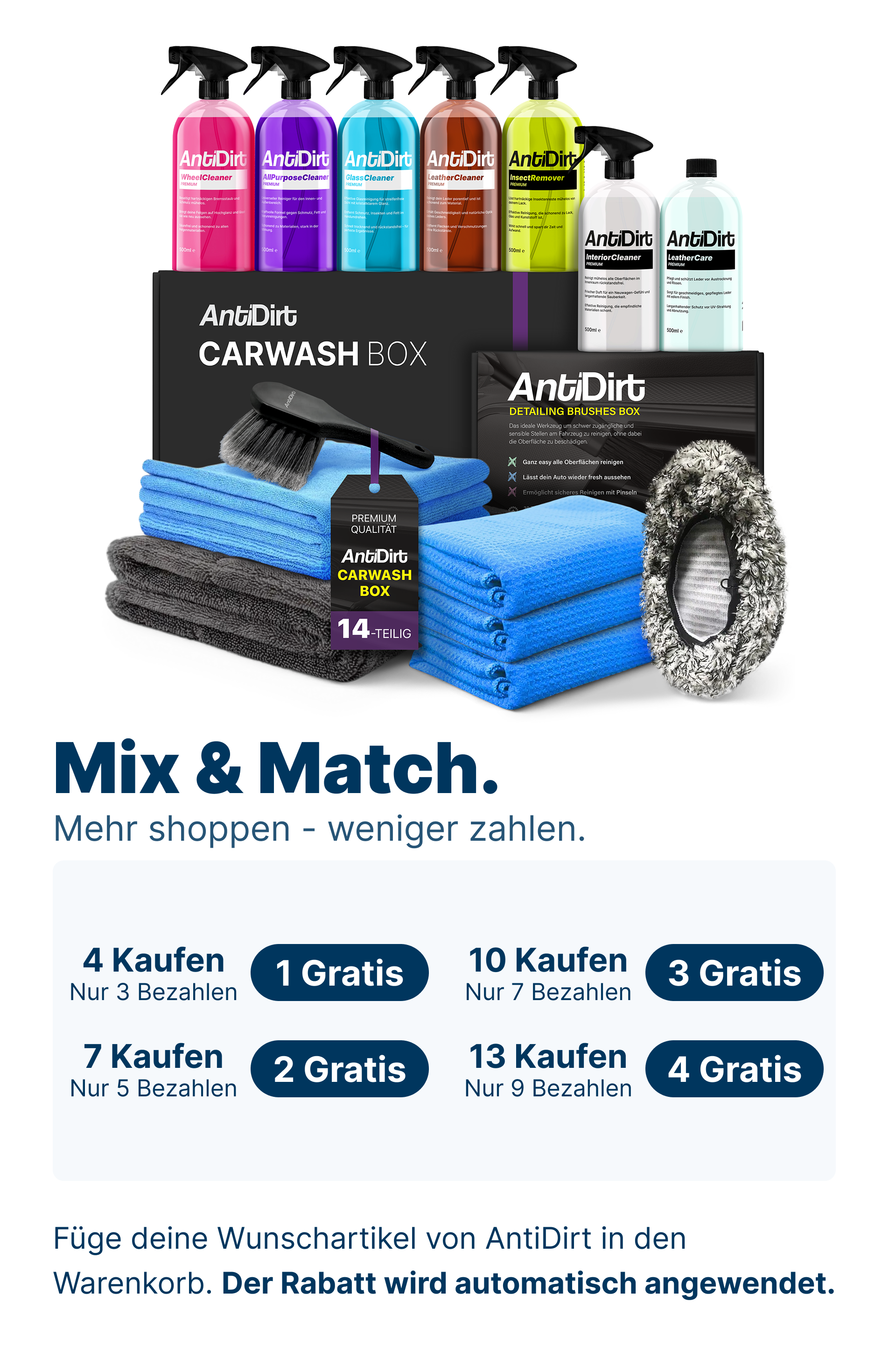 So funktioniert es: Autopflege muss überzeugen – nicht nur im Onlineshop oder im Regal, sondern vor allem an deinem Auto. Deshalb bekommst du bei AntiDirt 100 Tage, um unsere Produkte risikofrei zu testen. Kein Haken, kein Kleingedrucktes.